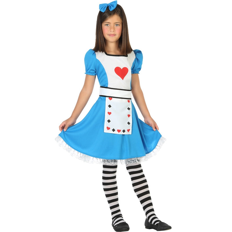Il costume Alice nel Paese delle Meraviglie per bambina comprende: Abito, cintura con grembiule e fascia con fiocco | Questo travestimento da ragazza Alice è disponibile in 4 diverse misure.