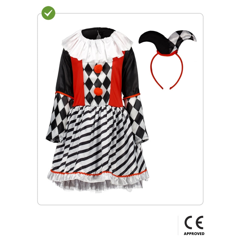 L'originale costume da Arlecchina Classica per bambine comprende: Vestito e cerchietto con mini cappello | Questo travestimento bambina da Arlecchino di carnevale classico è disponibile in 4 diverse misure