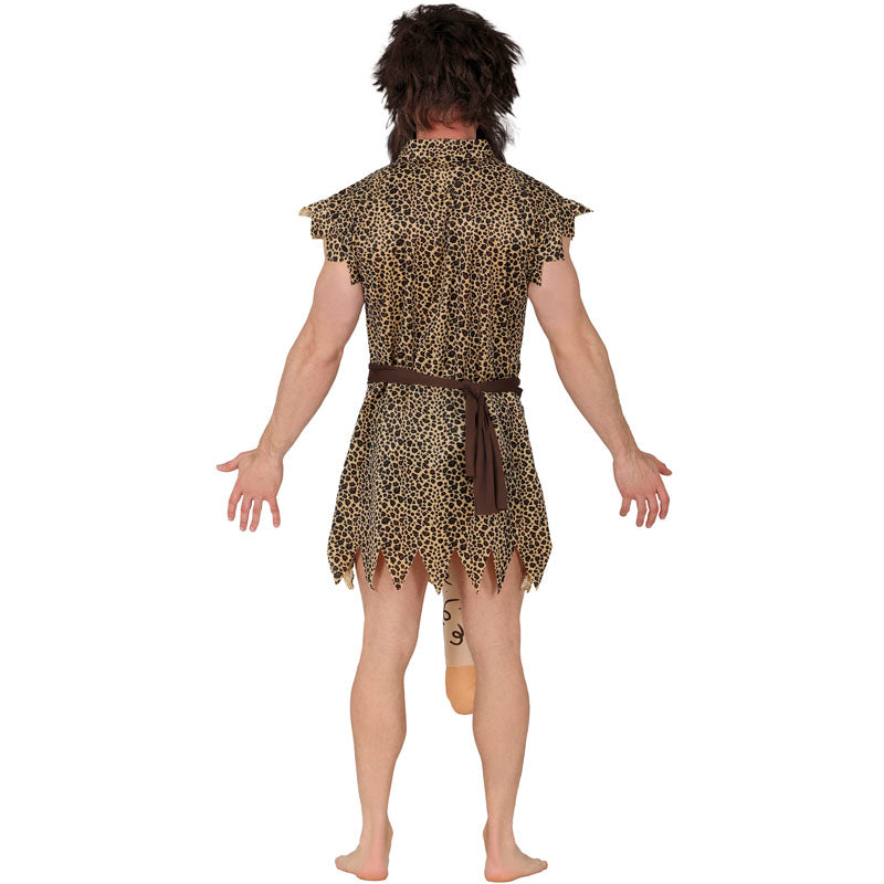 Il singolare costume da Cavernicolo ben dotato per uomini comprende: vestito, pene e cintura | Questo travestimento uomo da Troglodita comico è disponibile in 2 diverse misure