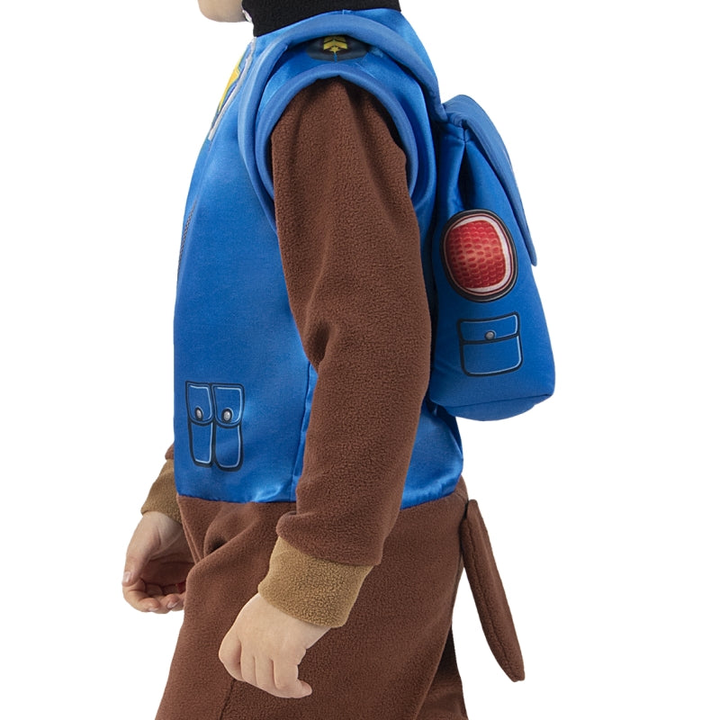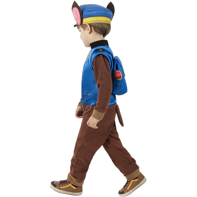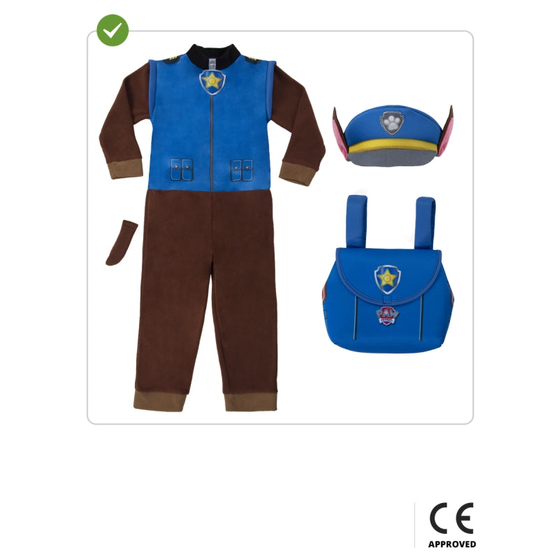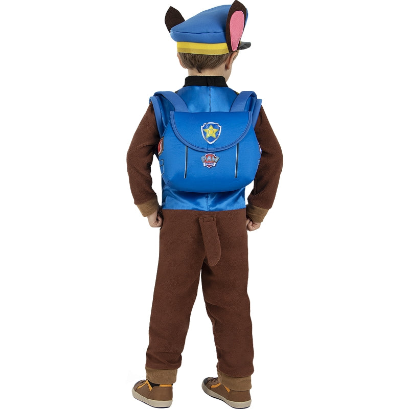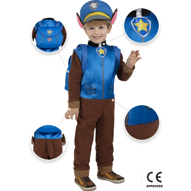 Il costume esclusivo di Chase – Paw Patrol per bambini include: Tuta, zaino e berretto | Questo costume per bambini che imita Chase – Paw Patrol è disponibile in 2 taglie diverse.