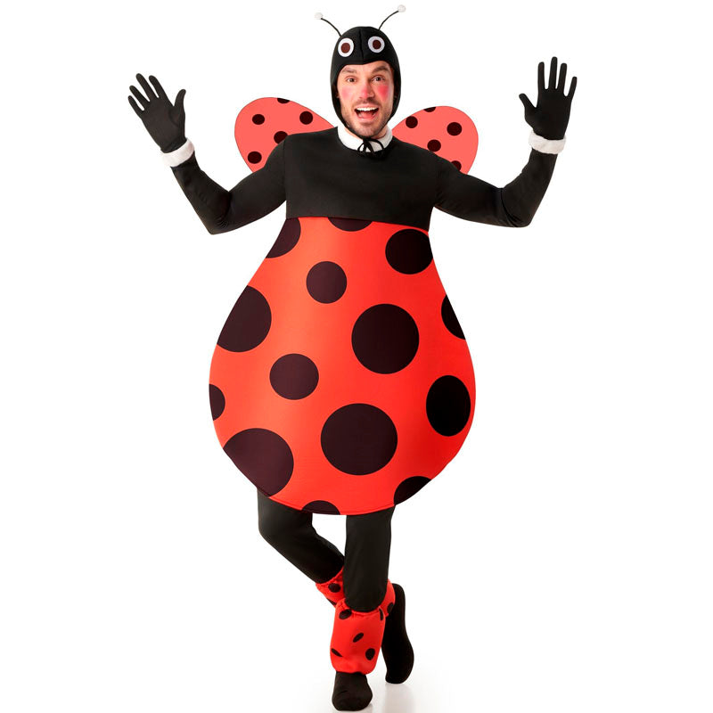 Il singolare costume da Coccinella paffuta per uomini comprende: corpo, cappuccio, scaldamuscoli e ali | Questo travestimento uomo da coccinella cicciottella è disponibile in 5 diverse misure