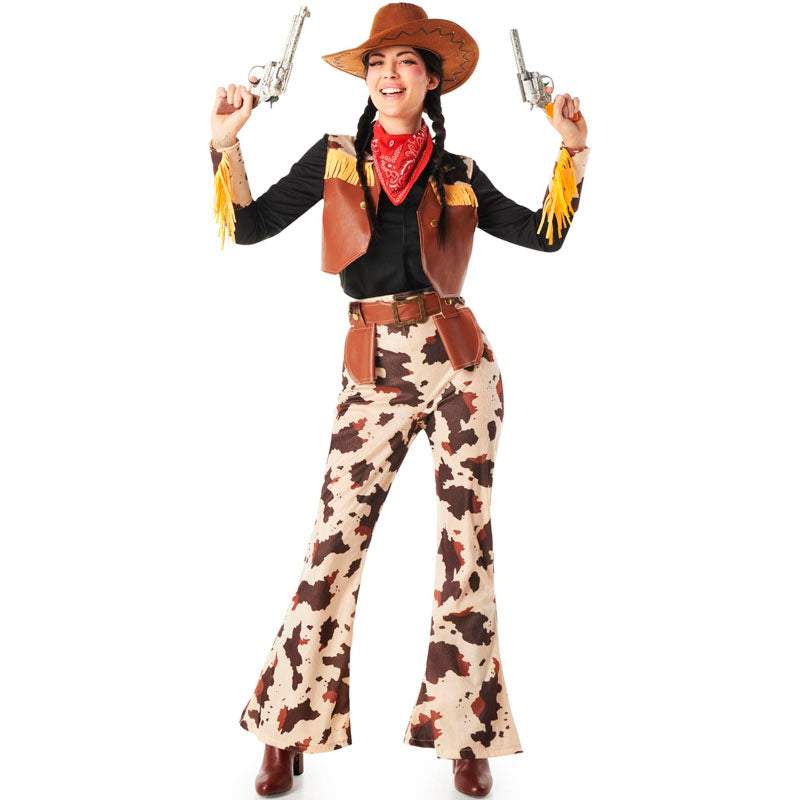 L'originale travestimento da Cowgirl del ranch robusta per donne comprende: gilet, pantaloni, cintura con cartucciere, polsini e fazzoletto | Questo costume donna cowgirl dura del West è disponibile in 4 diverse misure