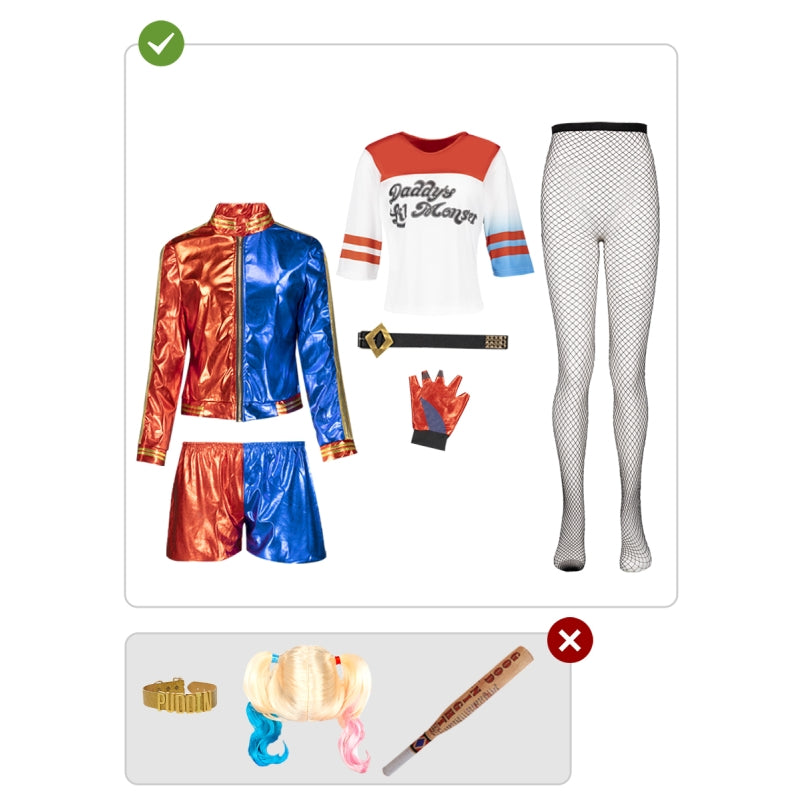 Questo esclusivo costume da Harley Quinn originale Suicide Squad per donne contiene: Giacca con ricami sul retro e paillettes sulle maniche, pantaloncini, maglietta con logo stampato, cintura in pelle regolabile, guanto e calze a rete | Questo costume da donna per trasformarti in anti-eroina caotica dell’universo DC dallo stile esplosivo è disponibile in 6 taglie diverse