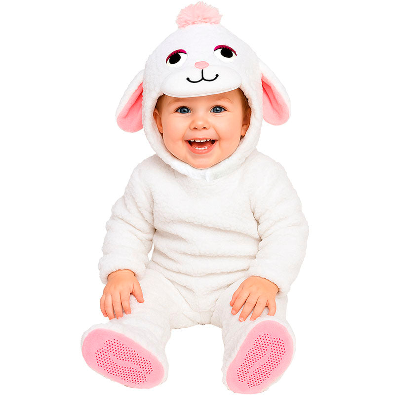 Il singolare costume da Pecora bianca per neonati comprende: tuta, cappuccio e copriscarpe | Questo travestimento neonato da Pecorella coccolosa è disponibile in taglia unica
