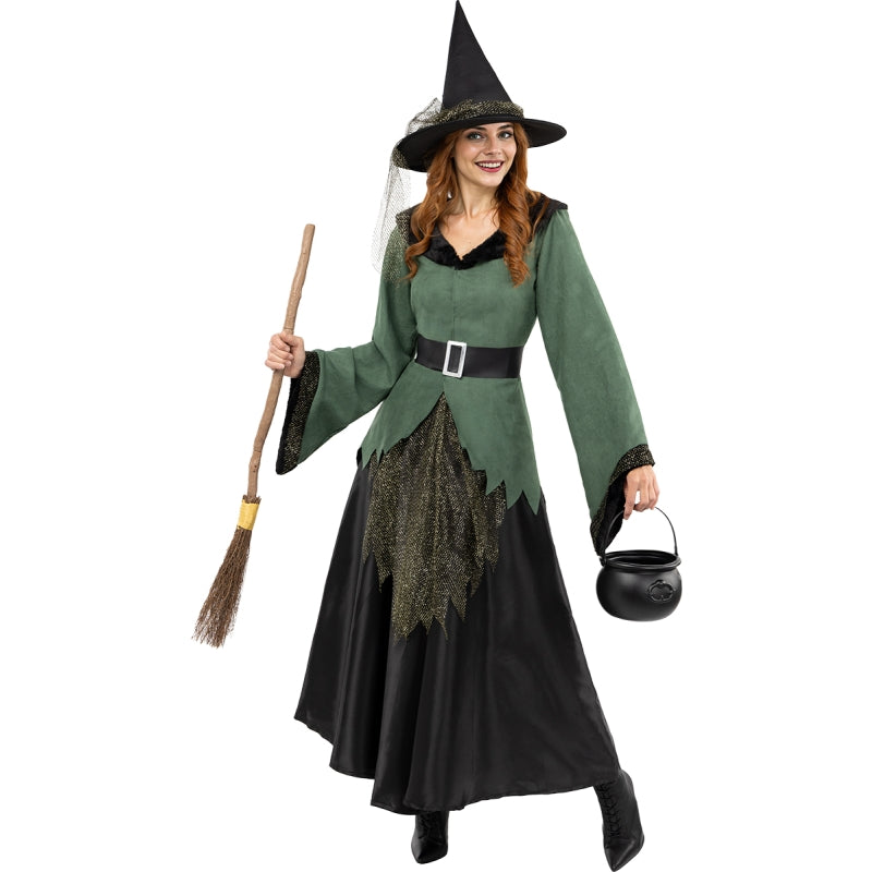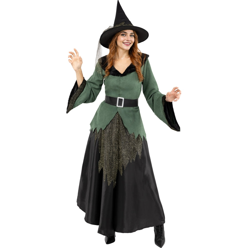 Questo esclusivo costume da Strega deluxe per donne contiene: Giacca, gonna, cintura e cappello con fiocco | Questo costume da donna per trasformarti in strega d’élite dal cappello a punta e aura potente è disponibile in 5 taglie diverse