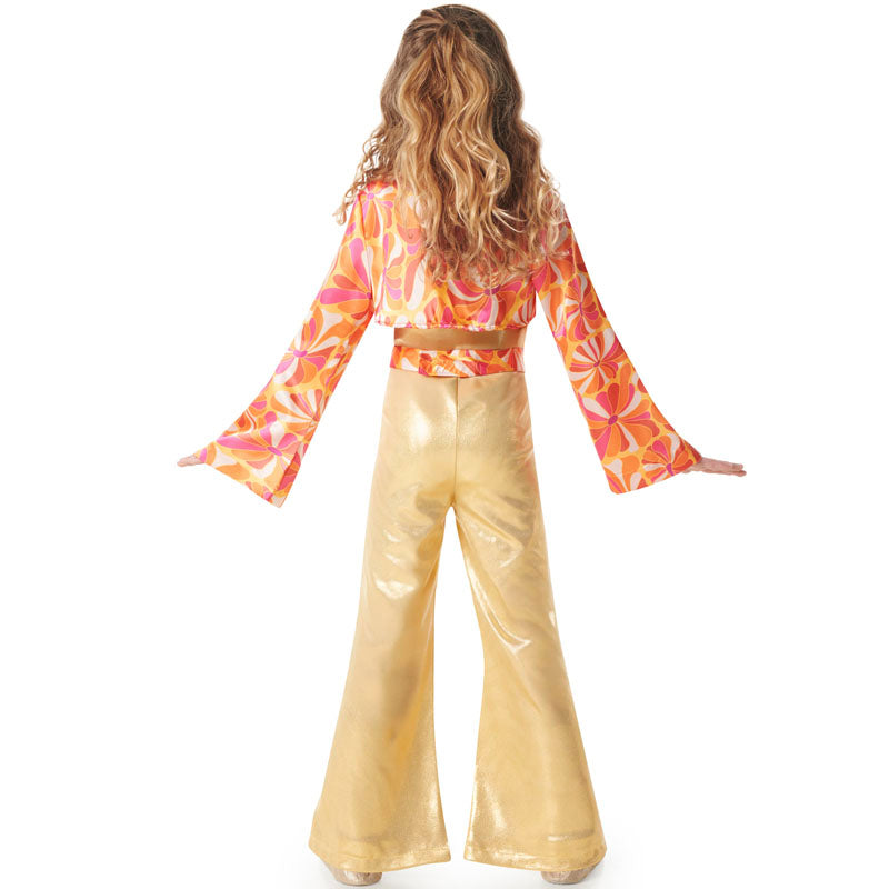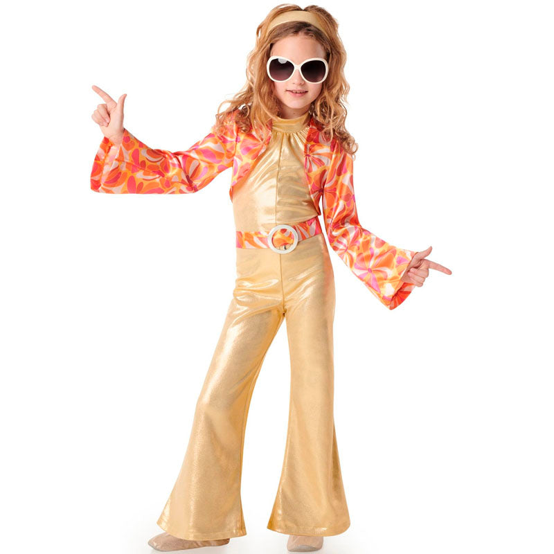 L'originale costume da Disco dorato anni ’70 per bambine comprende: diadema, giacca, tuta e cintura | Questo travestimento bambina da look disco dorato retrò è disponibile in 4 diverse misure