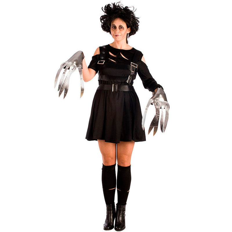 Il costume adulto che imita il personaggio creato da Tim Burton: Edward Mani di Forbice da donna include: Abito con cintura, guanti a forbice e scaldamuscoli | Questo travestimento da donna Edward Mani di Forbice è disponibile in taglia unica.