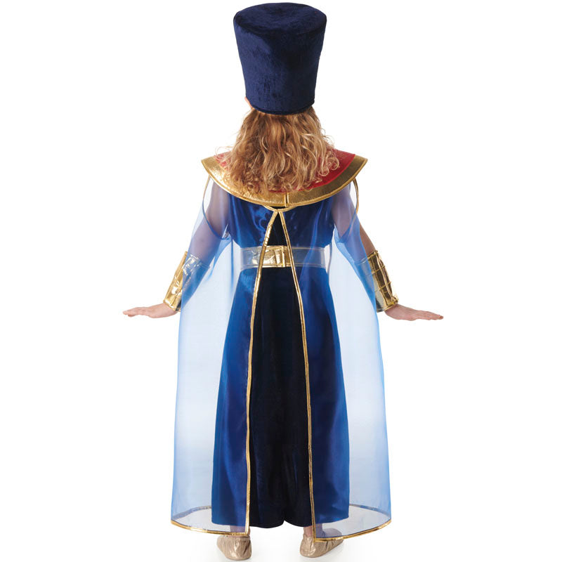L'originale costume da Egizia in velluto blu per bambine comprende: cappello, colletto, tunica, mantello, bracciali e cintura | Questo travestimento bambina da Egizia blu reale è disponibile in 4 diverse misure