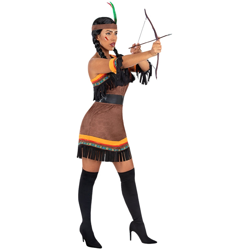 Questo esclusivo costume da Indiana Sexy Deluxe per donne contiene: Abito, cintura, bracciali e fascia per capelli con piuma | Questo costume da donna per trasformarti in nativa leggendaria con stile sofisticato è disponibile in 5 taglie diverse
