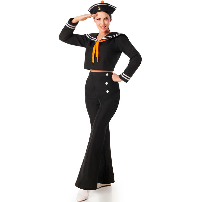 L'originale travestimento da Marinara nero e bianco per donne comprende: cappello, camicia e pantaloni | Questo costume donna marinaia classica è disponibile in 4 diverse misure