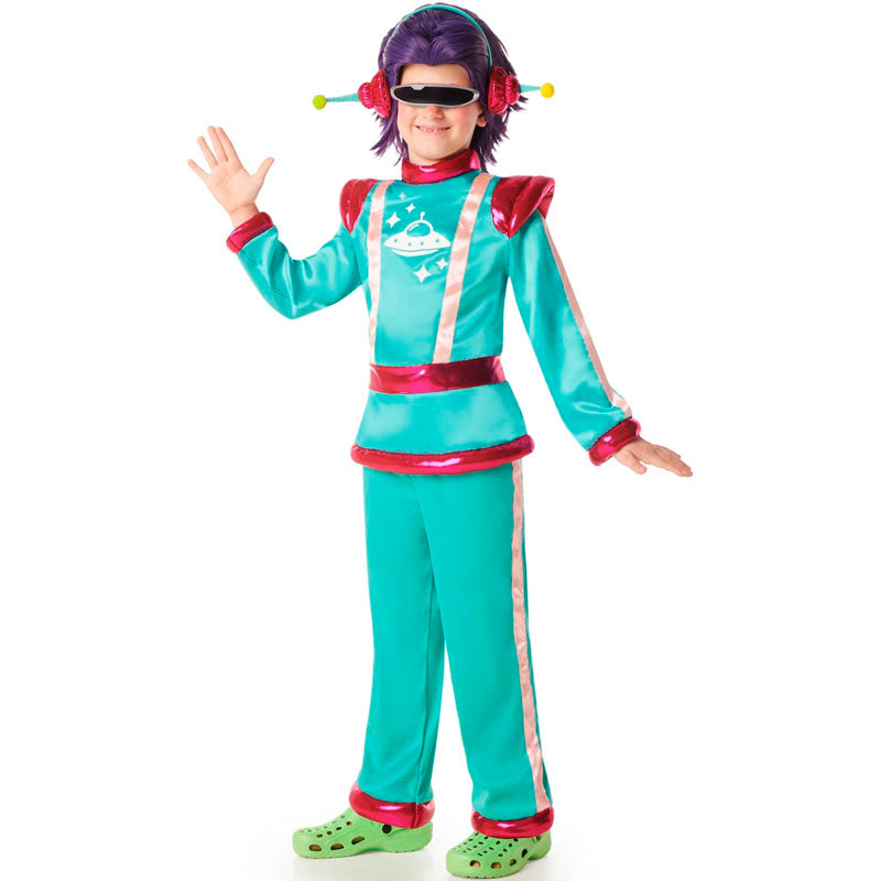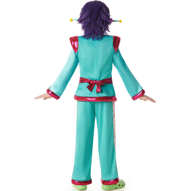 Il costume per bambini che imita un marziano extraterrestre per bambini include: tunica, cappuccio e guanti. Il costume marziano del ragazzo è disponibile in 4 taglie disponibili.