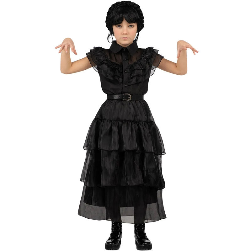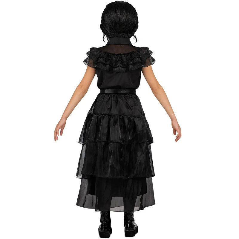 L'originale costume Halloween da Mercoledì Prom Queen per bambine comprende: vestito nero e cintura | Questo travestimento pauroso bambina da Mercoledì della Famiglia Addams che balla Goo Goo Muck dei The Cramps è disponibile in 4 diverse misure