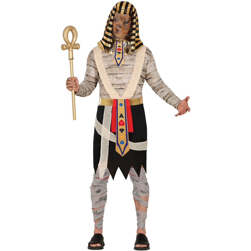 Il singolare costume Halloween da Mummia Egizia per uomini comprende: tunica, cintura, copricapo e colletto | Questo travestimento terribile uomo da Mummia del re Ramses è disponibile in 2 diverse misure
