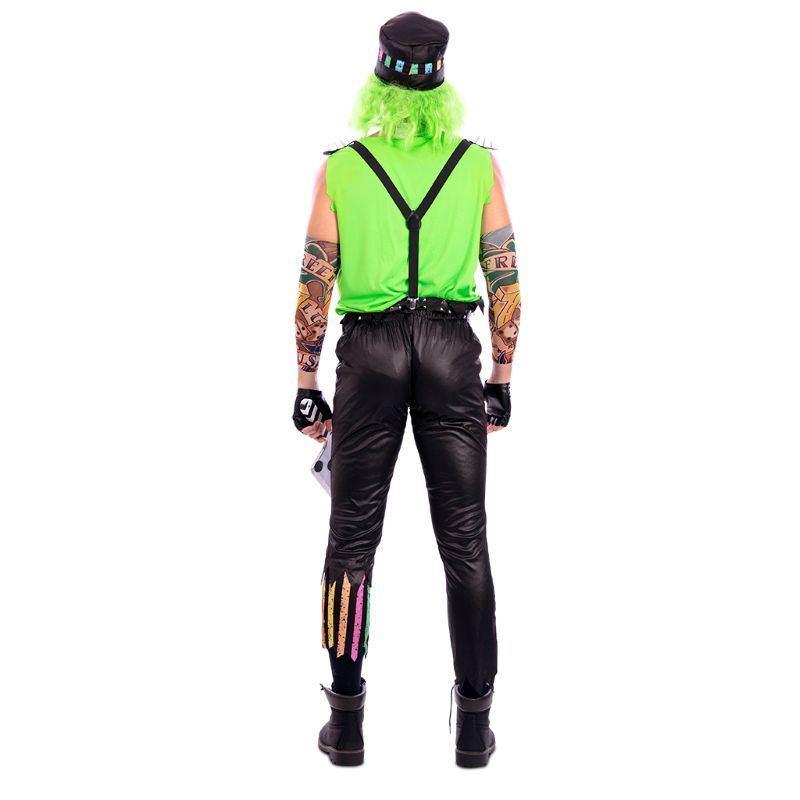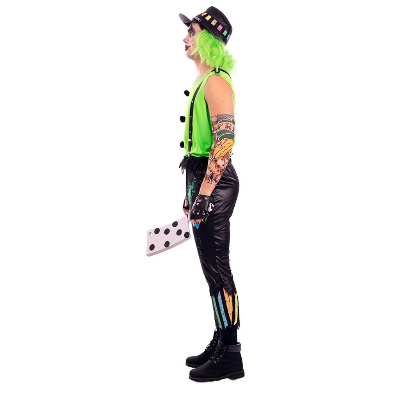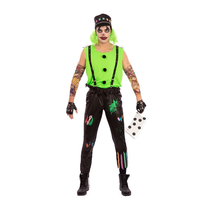 Il singolare costume Halloween da Pagliaccio Motociclista Assassino per uomini comprende: Maglietta, bretelle, pantaloni e cappello con parrucca | Questo travestimento terribile uomo da Pagliaccio Ribelle del Terrore è disponibile in 2 diverse misure
