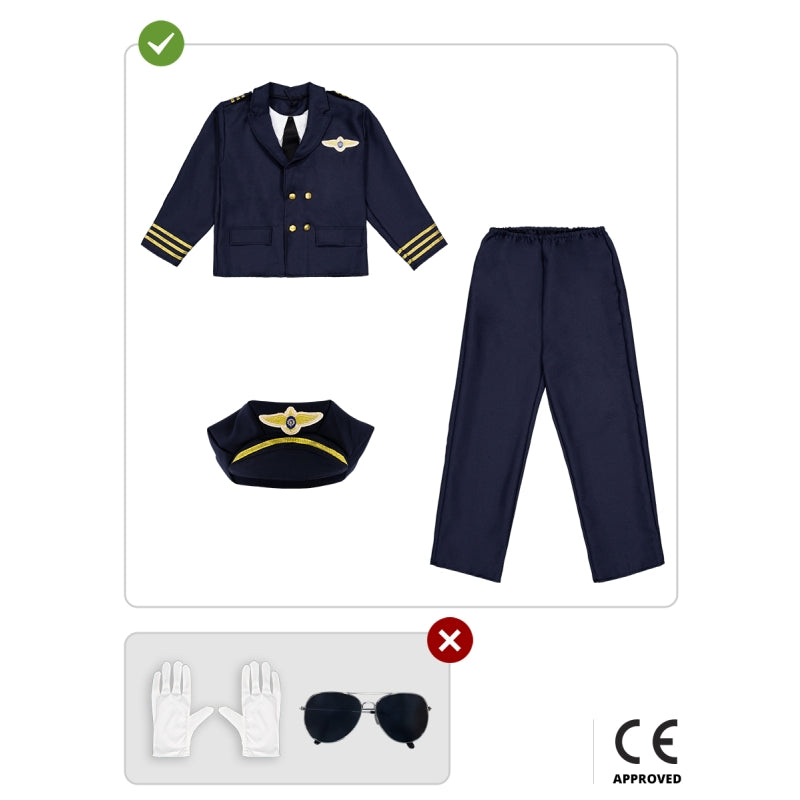 Il costume esclusivo di Pilota d’aereo per bambini include: Giacca con pettorina, cravatta, pantaloni e berretto | Questo costume per bambini che imita Pilota di caccia aereo è disponibile in 3 taglie diverse.