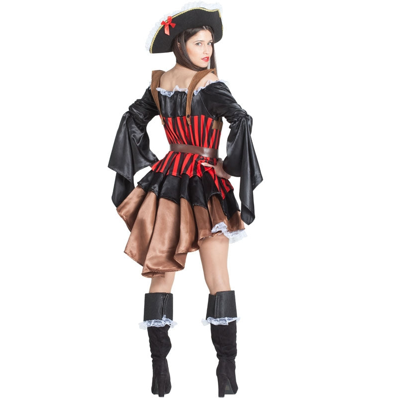 Il costume adulto che imita un pirata bucaniere da donna comprende: abito con sottogonna, cintura e copriscarpe | NON include cappello | Questo costume da pirata bucaniere da donna è disponibile in 3 diverse misure.