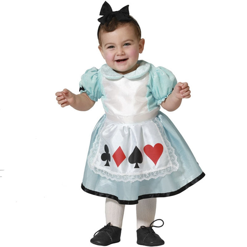 Il singolare costume da Principessa delle meraviglie per neonati comprende: abito e diadema | Questo travestimento neonato da Alice, dalla fiaba di Lewis Carroll è disponibile in 2 diverse misure