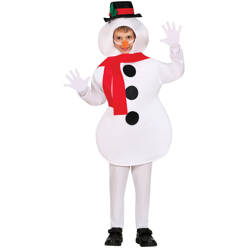 Costume classico da Pupazzo di Neve per bambini, con tuta con cappuccio e naso (body bianco non incluso). Disponibile in 2 taglie. Un costume natalizio divertente, ideale per celebrare le feste con stile.