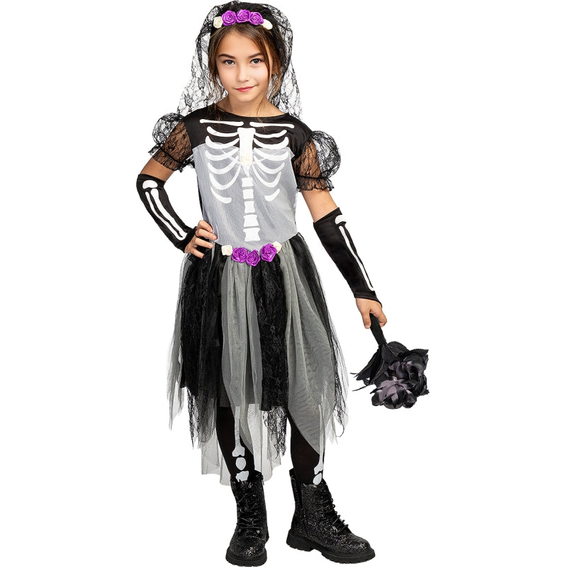 Il costume Sposa Scheletro con Pizzo per Bambina è stato progettato pensando al comfort e alla sicurezza, permettendo alle bambine di giocare e ballare per ore senza perdere lo stile. Le rifiniture in tulle e pizzo gli conferiscono un tocco elegante che spicca tra centinaia di costumi infantili di Halloween. La combinazione di toni scuri e fiori viola garantisce un look impattante e originale. Facile da indossare e togliere, è ideale per eventi scolastici, feste e concorsi di costumi.