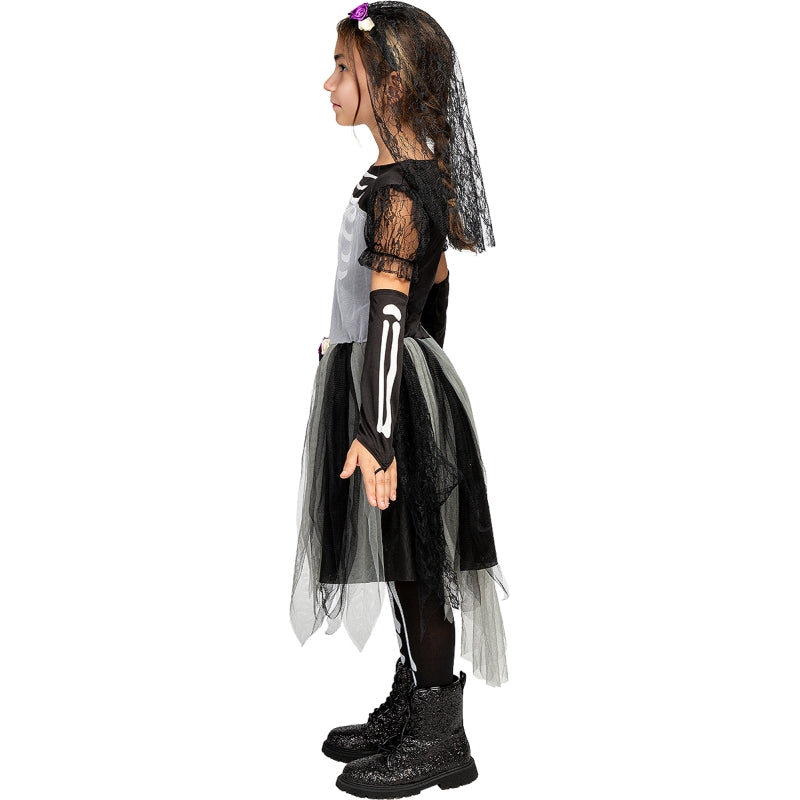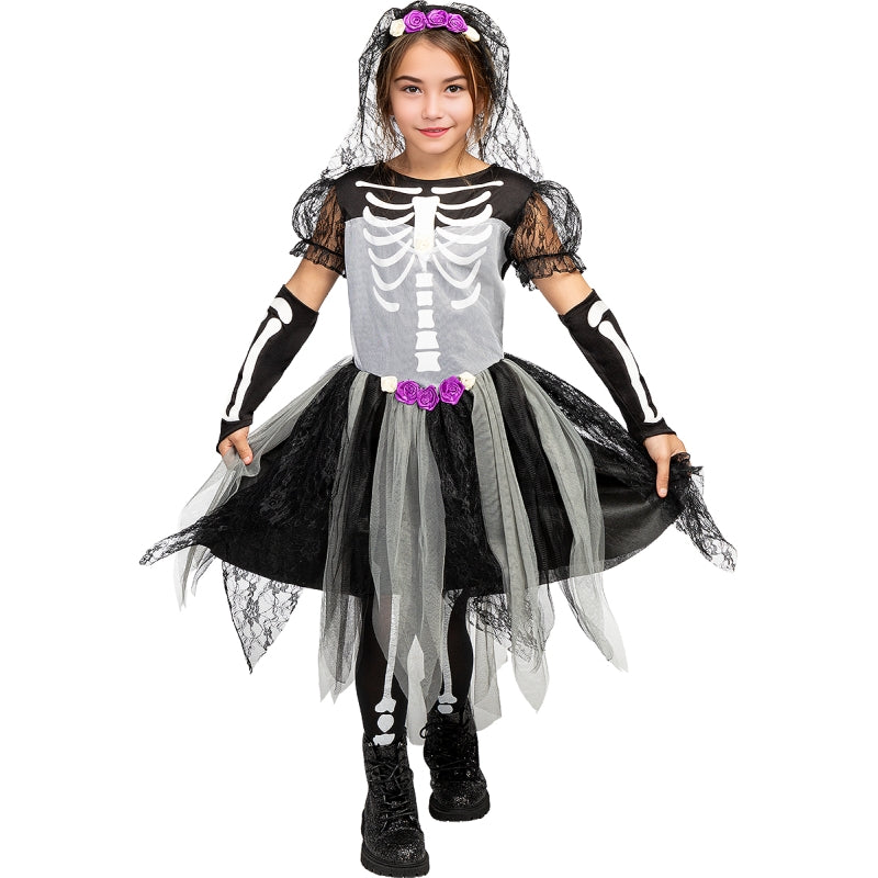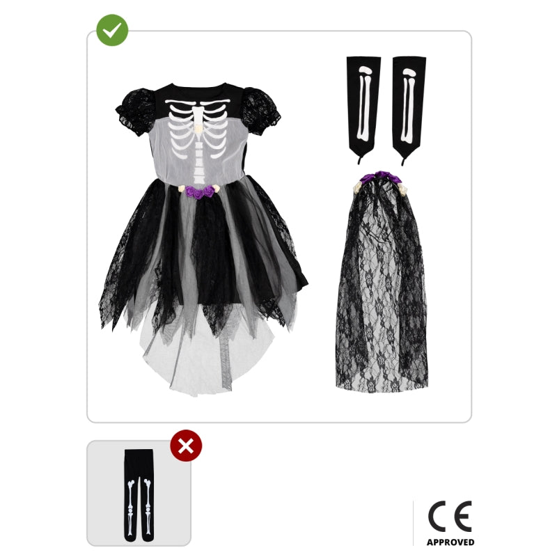 L'originale costume da Sposa Scheletro con Pizzo per bambine comprende: Abito, manicotti e cerchietto | Questo travestimento bambina da Sposa scheletro con pizzo bianco è disponibile in 4 diverse misure