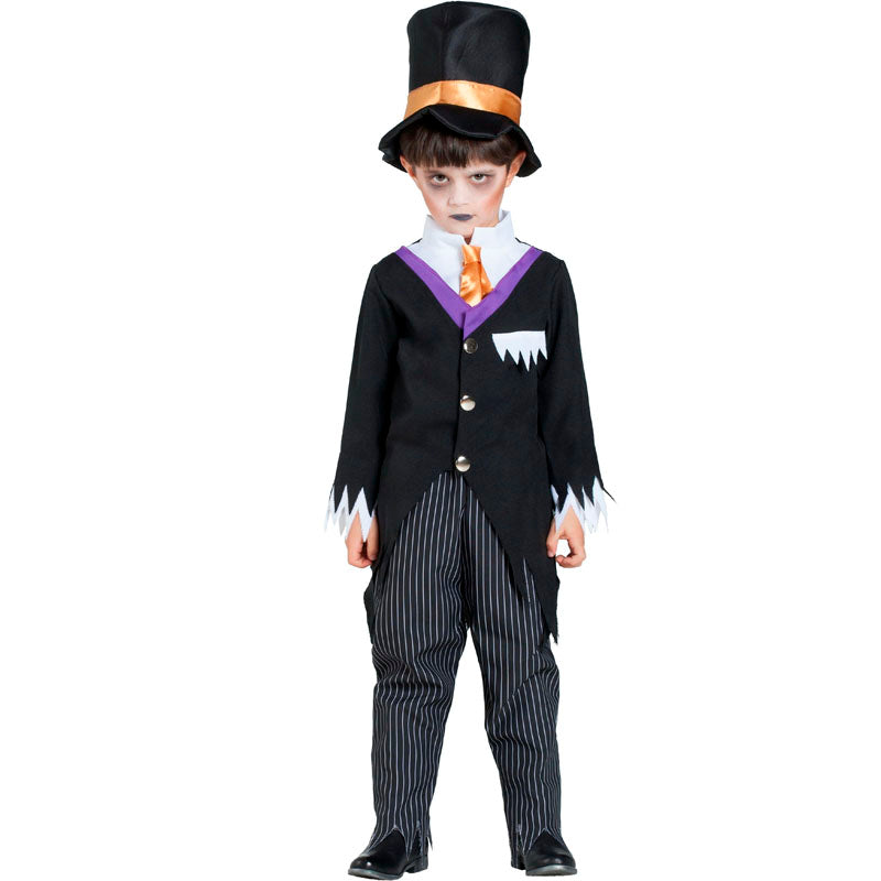 Il costume Halloween da Sposo Cadavere per bambini comprende: cappello, giacca con colletto e cravatta, e pantaloni | Questo travestimento spaventoso bambino che imita a sposo lugubre è disponibile in 4 diverse misure