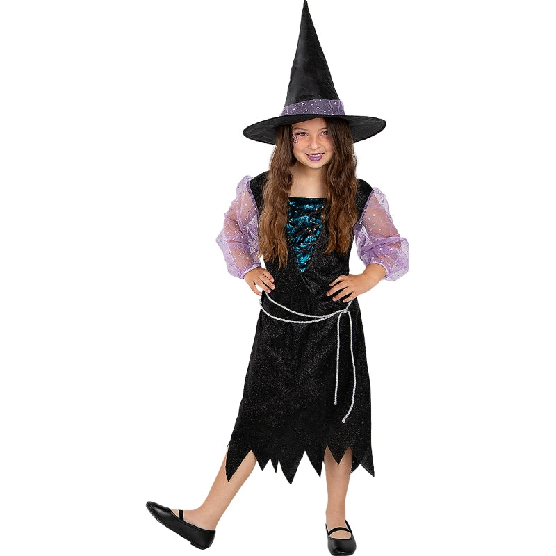 - Vestito da strega con dettagli brillanti e maniche di tulle viola