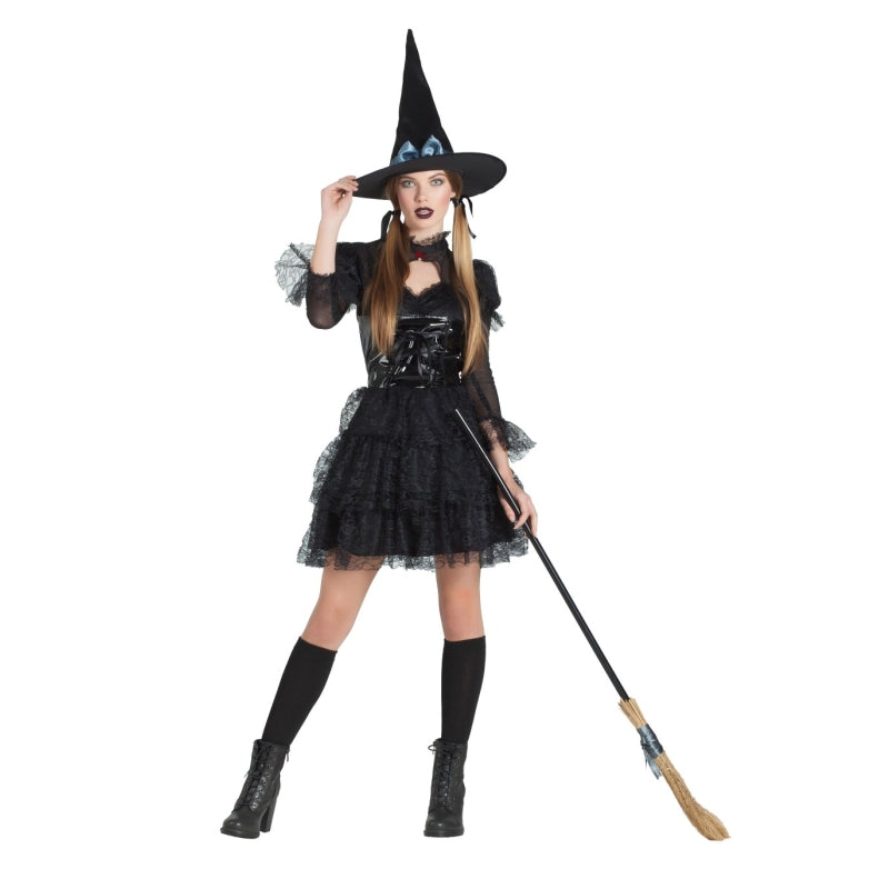 L'originale travestimento Halloween da Strega Lolita Gotica per donne comprende: Vestito con sottogonna, corsetto e cappello con fiocco | Questo costume terrificante donna Strega in Stile Gotico è disponibile in 3 diverse misure