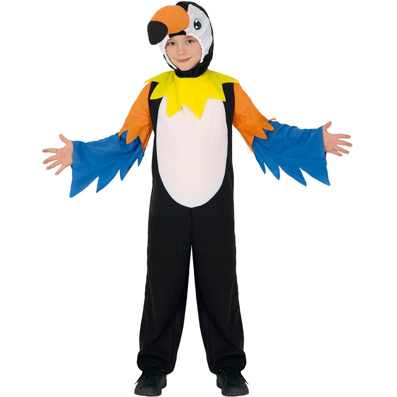 Il costume originale per bambini e bambine di Tucano include: tuta e cappuccio | Questo travestimento per bambini che imita Tucano esotico è disponibile in 3 taglie diverse
