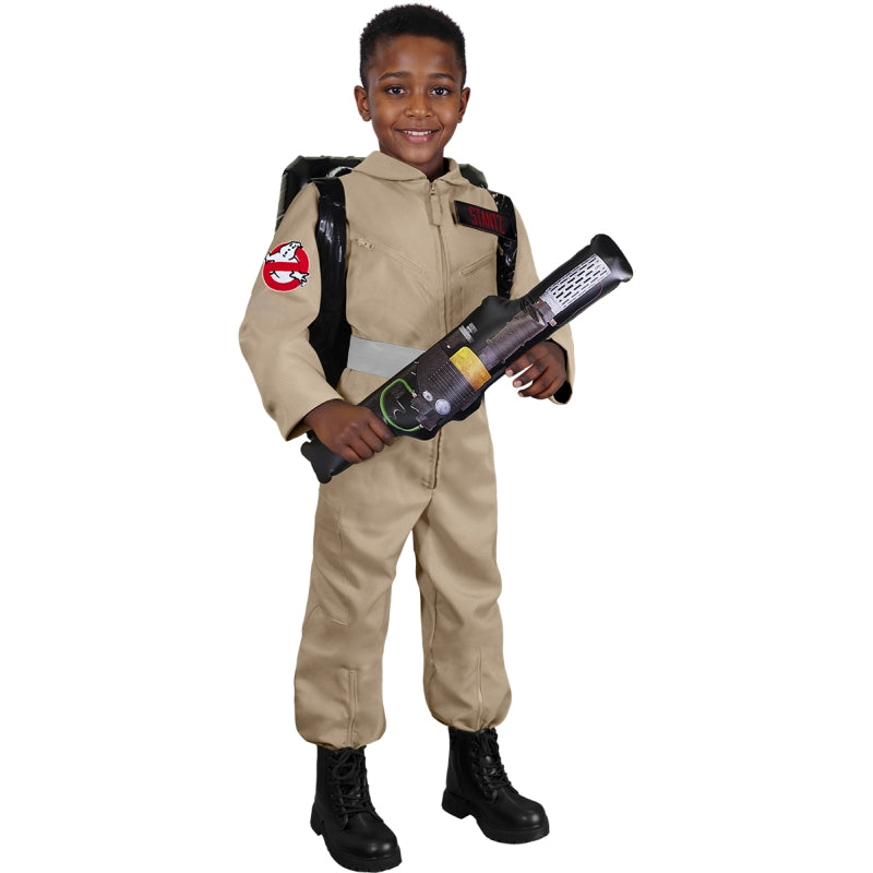 Costume ufficiale degli Acchiappafantasmi per bambini con tuta con 4 patch e zaino con pistola gonfiabile. Disponibile in 4 taglie. Ideale per catturare fantasmi con stile.