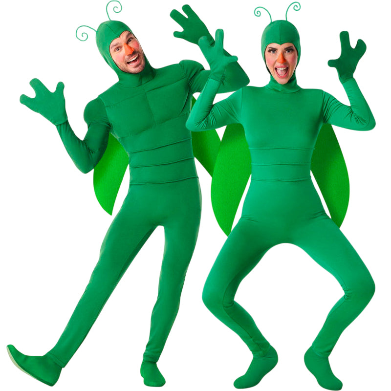 Il costume Cavalletta verde per uomo include: cappuccio, tuta, ali e guanti, mentre il costume Cavalletta verde per donna contiene: cappuccio, tuta, ali e guanti.