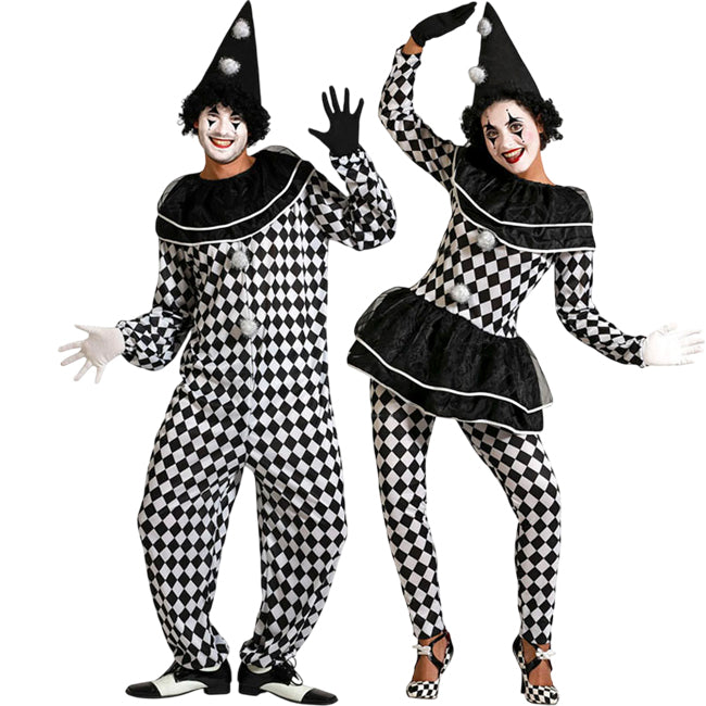 Costumi coordinati da arlecchini bianco e nero, con motivi classici e accessori in stile circo tradizionale.