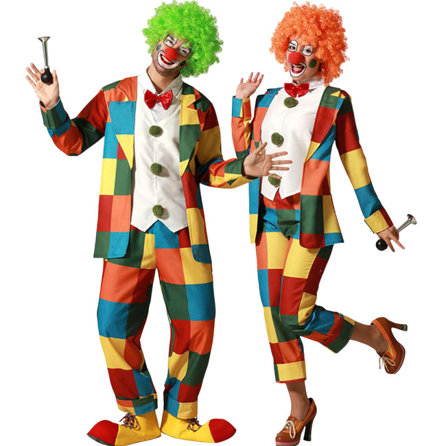Il costume da Clown con giacca per uomo include: colletto, giacca con gilet e pantaloni, mentre il costume da Clown con giacca per donna contiene: colletto, giacca e pantaloni.