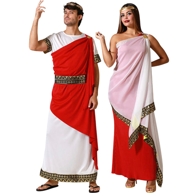 Il costume da Senatore Romano per uomo include: tunica, mantello e cintura, mentre il costume da Senatrice romana per donna contiene: abito e mantello.
