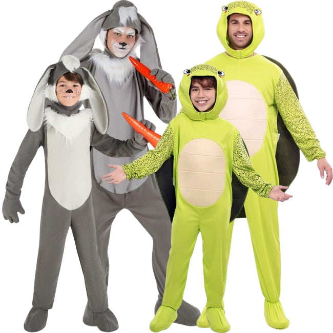 Idea fantastica per travestire tutta la tua famiglia da Favola della Lepre e della Tartaruga, con modelli coordinati per uomo, donna, bambino e bambina.