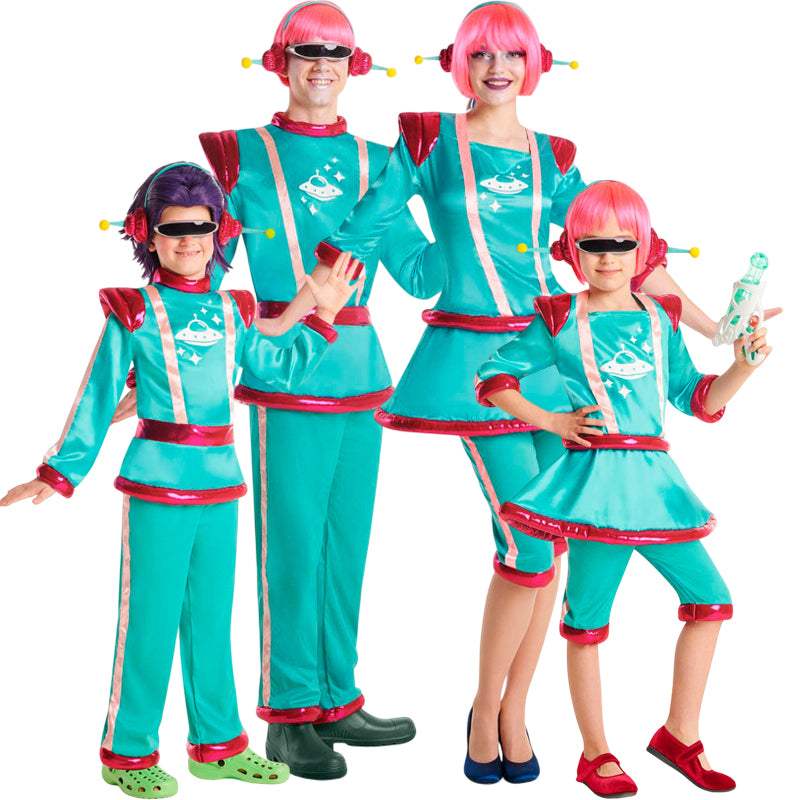 Un'idea fantastica per vestire tutta la famiglia da Marziani verde turchese con disegni coordinati per uomo, donna, bambino e bambina.È possibile accedere ai contenuti di ciascun costume nella sezione 'Completa il tuo look', dove ogni costume appartenente a questo gruppo è elencato singolarmente.