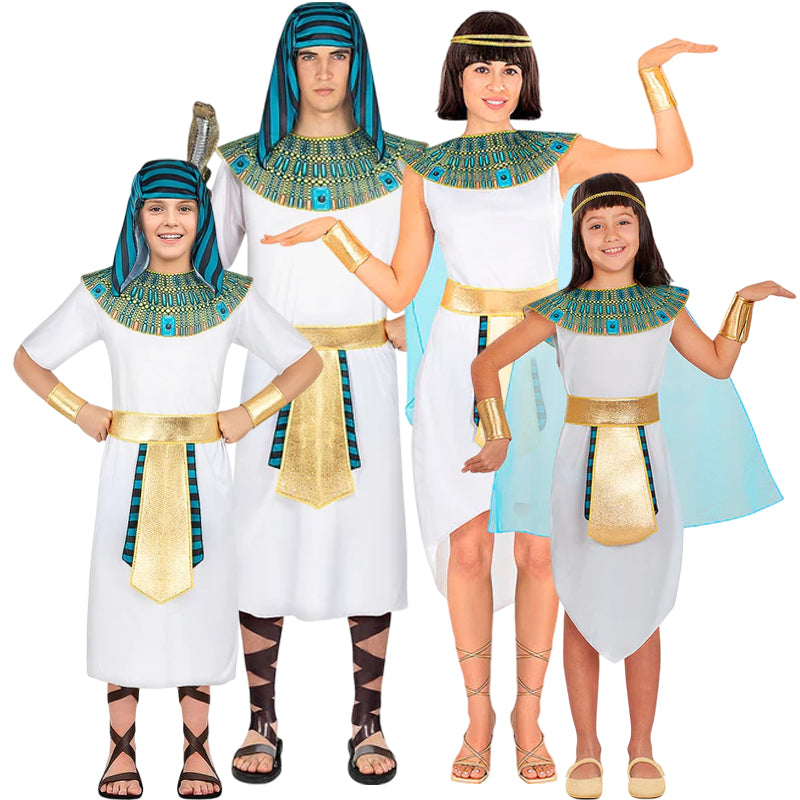I costumi egiziani per tutta la famiglia offrono un look maestoso, coordinato ed economico, ideale per un costume egiziano di gruppo che cerchi un effetto spettacolare.