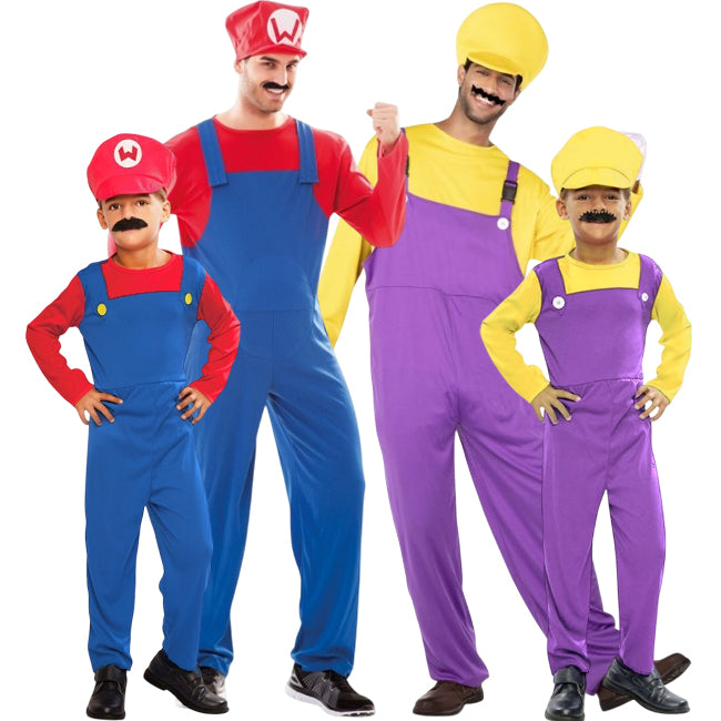 Idea fantastica per travestire tutto il tuo gruppo da Super Marios e Warios, con modelli coordinati per adulti e bambini.